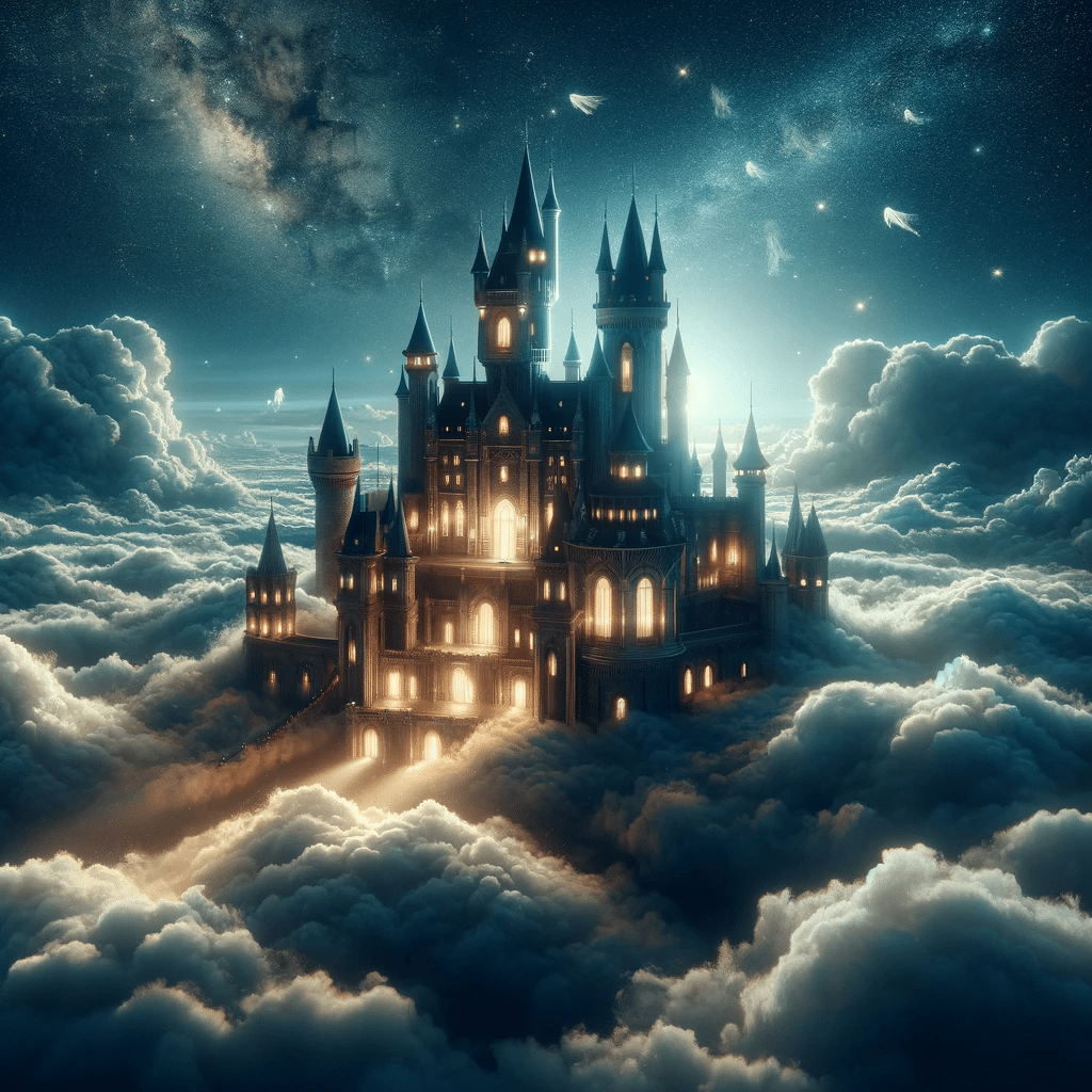 The Castle Beyond the Clouds was a spectacle that defied imagination. Its ivy-clad walls radiated a warm, golden glow that melted into the starry night. Majestic spires reached towards the heavens, punctuating the surreal skyline. A waterfall cascaded down from some mysterious source in the sky, its crystal-clear waters reflecting the moonlight as it plummeted past the castle and disappeared into the clouds beneath.