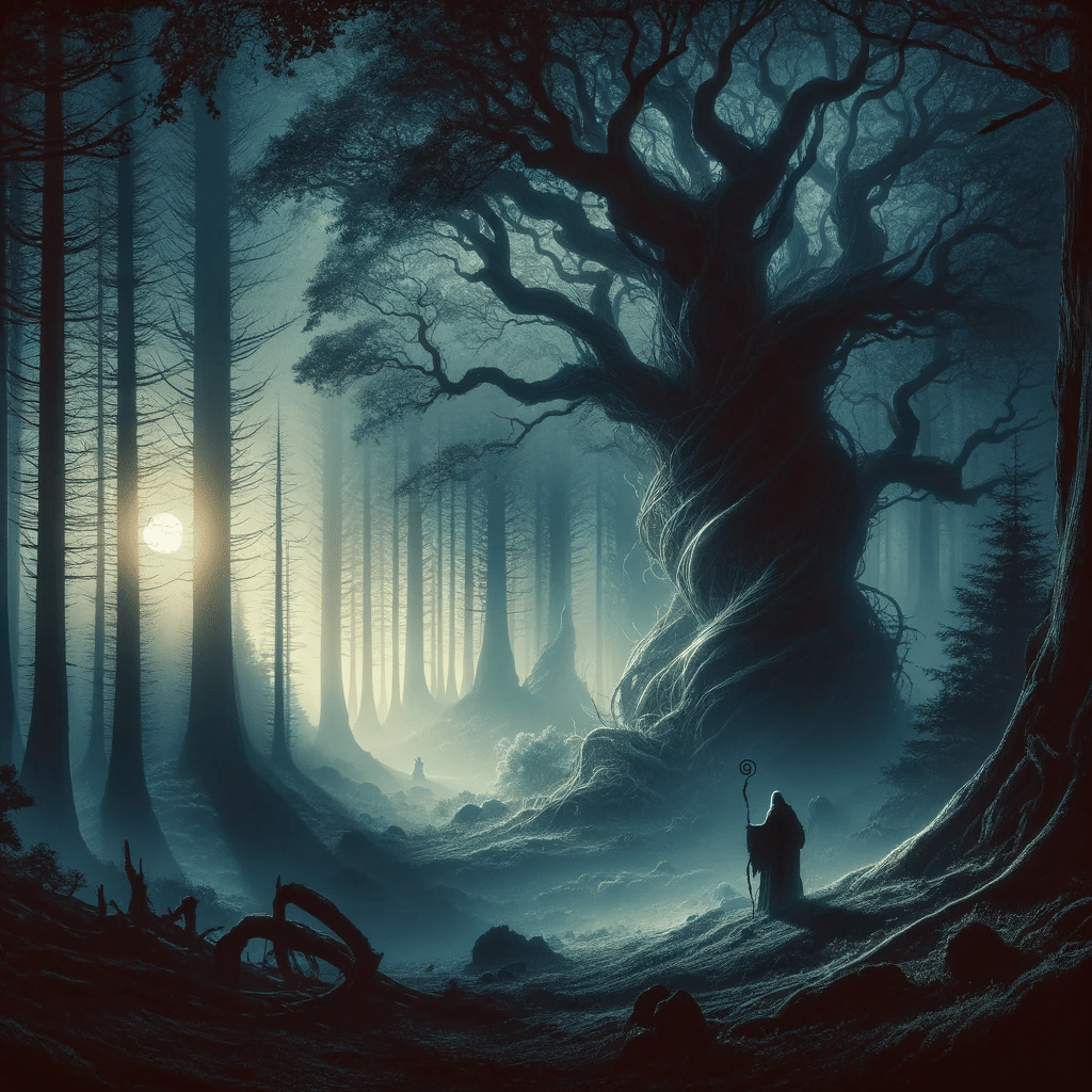 Once upon a time, in a land where darkness and light mingled, close to the edge of an ancient forest, there lived a wise hermit. This forest was a particular kind woven from twilight’s shroud, where shadows softly whispered and a pale glow of the moon often danced through the trees like an ethereal ballet.