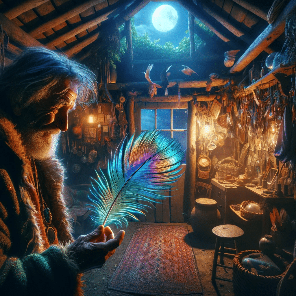 One night, Elias searched through his vast collection of curiosities and strange trinkets that he had gathered from his lifelong journey. His weather-beaten hand emerged holding a brilliant multicolored feather, catching the moonlight and casting vibrant reflections around his small hut. This was no ordinary feather; it was a Phoenix’s Feather.