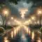 The streetlights, their glow diffused by the heavy raindrops, created an ethereal ambiance. The amber light mingled with the falling water, casting a golden hue upon the wet asphalt below. Each raindrop danced and sparkled in the artificial glow, as if striving to outshine the luminous cityscape.